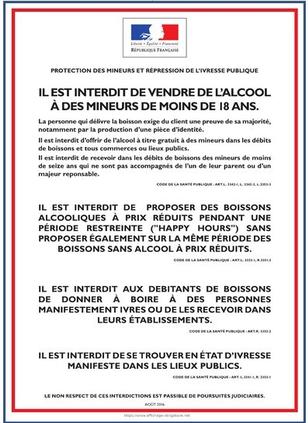 Vous devez afficher la réglementation sur la répression de l'ivresse publique et la protection des mineurs (interdiction de vente d'alcool aux moins de 18 ans).